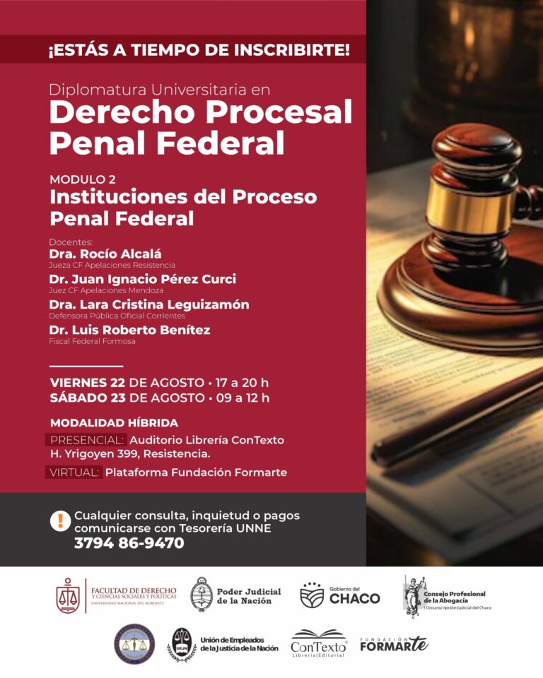 Inscripción: https://www.dch.unne.edu.ar/academica/estudiantes/carreras/diplomatura-universitaria-en-derecho-procesal-penal-federal/
